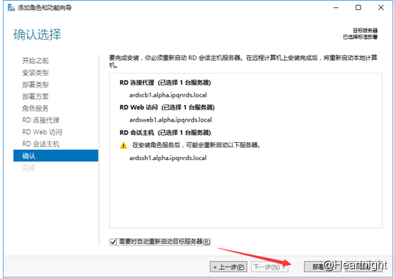 如下图,为RDCB的角色分配,图中仅为操作演示,应在服务器池中选择对应的角色的服务器。点选“下一步”。接下来的web与会话主机的操作类似。