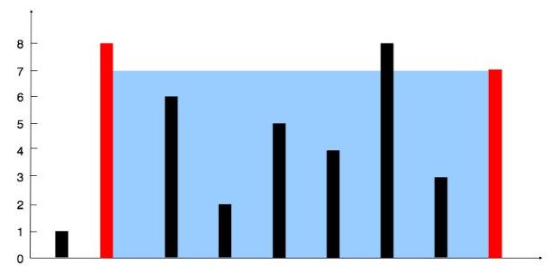 给你 n 个非负整数 a1,a2,...,an,每个数代表坐标中的一个点 (i, ai) 。在坐标内画 n 条垂直线,垂直线 i 的两个端点分别为 (i, ai) 和 (i, 0) 。找出其中的两条线,使得它们与 x 轴共同构成的容器可以容纳最多的水。