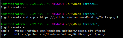 1、git remote -v查看已用别名; git remote add apple[别名] [远程库地址] 给远程库起别名