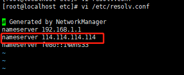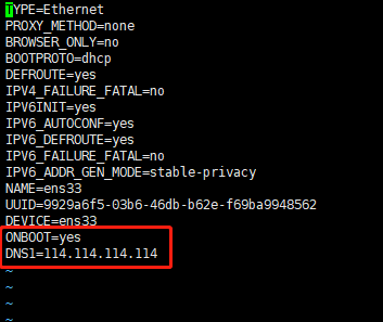 2、需要把ONBOOT属性改成yes,并且加一个DNS1=114.114.114.114