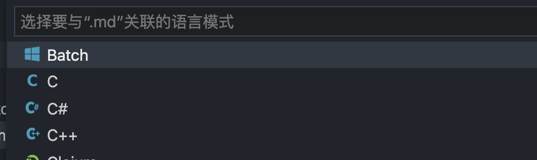 步骤4:搜索框内输入markdown,也可以下滑查找需要的语言模式,因为已经关联了markdown ,所以显示当前关联语言。