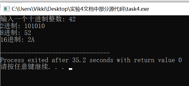 #include <stdio.h> void dec2n(int x, int n); // 函数声明 int main() { int x; printf("输入一个十进制整数: "); scanf("%d", &x); dec2n(x, 2); // 函数调用: 把x转换成二进制输出 dec2n(x, 8); // 函数调用: 把x转换成八进制输出 dec2n(x, 16); // 函数调用: 把x转换成十六进制输出 return 0; } // 函数定义 // 功能: 把十进制数x转换成n进制,打印输出 // 补足函数实现 // 待补足 void dec2n( int x,int n) { int t[100],i,count=0; for(i=0;x!=0;i++){ t[i]=x%n; x=x/n; count++; } if (t[i]>9) switch(t[i]){ case 10:t[i]=‘A‘;break; case 11:t[i]=‘B‘;break; case 12:t[i]=‘C‘;break; case 13:t[i]=‘D‘;break; case 14:t[i]=‘E‘;break; case 15:t[i]=‘F‘;break; default:break; } printf("%d进制: ",n); for(i=count-1;i>=0;i--){ printf("%X",t[i]); } printf("\n"); }