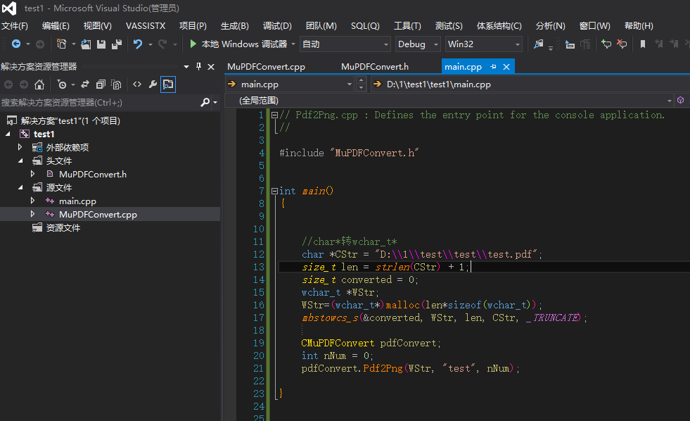 // Pdf2Png.cpp : Defines the entry point for the console application. // #include "MuPDFConvert.h" int main() { //char*转wchar_t* char *CStr = "D:\\1\\test\\test\\test.pdf"; size_t len = strlen(CStr) + 1; size_t converted = 0; wchar_t *WStr; WStr=(wchar_t*)malloc(len*sizeof(wchar_t)); mbstowcs_s(&converted, WStr, len, CStr, _TRUNCATE); CMuPDFConvert pdfConvert; int nNum = 0; pdfConvert.Pdf2Png(WStr, "test", nNum); }