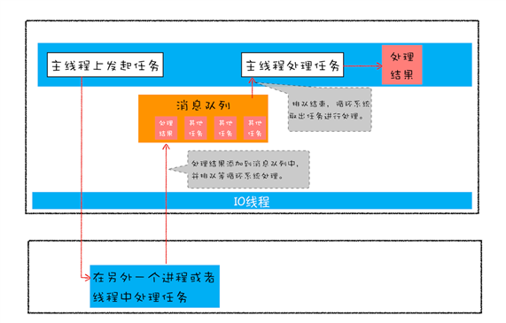 上图展示的是一个标准的异步编程模型,页面主线程发起了一个耗时的任务,并将任务交给另外一个进程去处理,这时页面主线程会继续执行消息队列中的任务。等该进程处理完这个任务之后,会将该任务添加到渲染进程的消息队列中,并排队等待循环系统的处理。排队结束之后,循环系统会取出消息队列中的任务进行处理,并触发相关的回调操作。