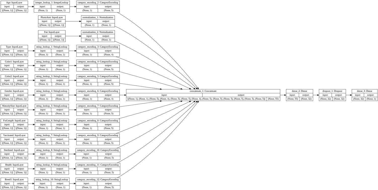 all_inputs = [] encoded_features = [] # Numeric features. for header in [‘PhotoAmt‘, ‘Fee‘]: numeric_col = tf.keras.Input(shape=(1,), name=header) normalization_layer = get_normalization_layer(header, train_ds) encoded_numeric_col = normalization_layer(numeric_col) all_inputs.append(numeric_col) encoded_features.append(encoded_numeric_col) # Categorical features encoded as string. categorical_cols = [‘Type‘, ‘Color1‘, ‘Color2‘, ‘Gender‘, ‘MaturitySize‘, ‘FurLength‘, ‘Vaccinated‘, ‘Sterilized‘, ‘Health‘, ‘Breed1‘] for header in categorical_cols: categorical_col = tf.keras.Input(shape=(1,), name=header, dtype=‘string‘) encoding_layer = get_category_encoding_layer(header, train_ds, dtype=‘string‘, max_tokens=5) encoded_categorical_col = encoding_layer(categorical_col) all_inputs.append(categorical_col) encoded_features.append(encoded_categorical_col)