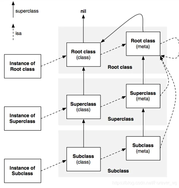 类方法 isKindOfClass 会先判断是否等于对象的元类,不等就继续循环,判断是否等于对象的元类的父类。若相等,结束返回YES,若不相等,继续循环迭代。若最终判断至 NSObject 的父类 为 nil ,结束返回NO。先判断 isa ,再判断 superclass 。