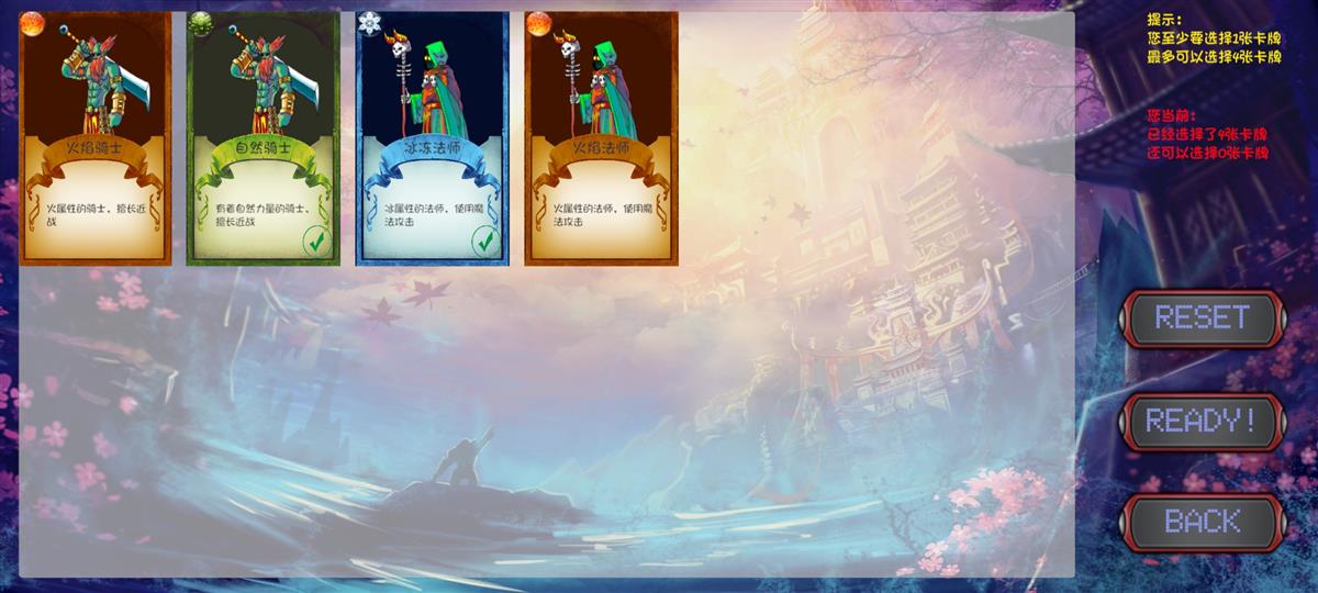 ? 步骤7. 在主菜单界面点击”CARD MANAGE“进入卡牌管理界面。在卡牌管理界面中,可以根据右上方的文字提示选择使用的牌组,点击右下方”RESET“按钮可重置卡牌选择(注:由于游戏默认选择卡牌数大于0,因此重置后仍会保留一张卡牌,可以通过选择其余卡牌进行更换),选择完毕点击”READY!"按钮确认后跳转到开始游戏-模式选择界面。点击”BACK“返回主菜单,系统会自动记录最后的卡牌选择。