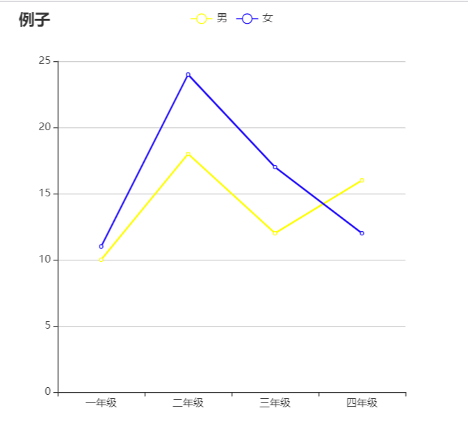 <!DOCTYPE html> <html lang="en"> <head> <meta charset="UTF-8"> <title>Echarts 图表数据颜色和图例不对应</title> <!-- 引入 echarts.js --> <script src="https://cdn.staticfile.org/echarts/4.3.0/echarts.min.js"></script> </head> <body> <div id="ec_div" style="width: 500px; height: 500px; position: absolute; left: 50%; transform: translate(-50%)"> </div> <script> var eccharts_one = echarts.init(document.getElementById("ec_div")); var option = { title: { text: ‘例子‘ }, tooltip: {}, legend: { data: [‘男‘,‘女‘] }, xAxis: { data: [‘一年级‘,‘二年级‘,‘三年级‘,‘四年级‘] }, yAxis: {}, series: [{ name: ‘男‘, type: ‘line‘, data: [10,18,12,16], itemStyle: { normal: { lineStyle: ‘yellow‘ } } },{ name: ‘女‘, type: ‘line‘, data: [11,24,17,12], itemStyle: { normal: { lineStyle: ‘blue‘ } } }] } eccharts_one.setOption(option); </script> </body> </html>