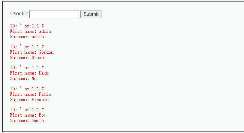 <?php if( isset( $_REQUEST[ ‘Submit‘ ] ) ) { // Get input $id = $_REQUEST[ ‘id‘ ]; // Check database $query = "SELECT first_name, last_name FROM users WHERE user_id = ‘$id‘;"; $result = mysqli_query($GLOBALS["___mysqli_ston"], $query ) or die( ‘<pre>‘ . ((is_object($GLOBALS["___mysqli_ston"])) ? mysqli_error($GLOBALS["___mysqli_ston"]) : (($___mysqli_res = mysqli_connect_error()) ? $___mysqli_res : false)) . ‘</pre>‘ ); // Get results while( $row = mysqli_fetch_assoc( $result ) ) { // Get values $first = $row["first_name"]; $last = $row["last_name"]; // Feedback for end user echo "<pre>ID: {$id}<br />First name: {$first}<br />Surname: {$last}</pre>"; } mysqli_close($GLOBALS["___mysqli_ston"]); } ?>