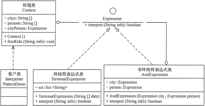 package net.biancheng.c.interpreter; //抽象表达式类 interface AbstractExpression { public void interpret(String info); //解释方法 } //终结符表达式类 class TerminalExpression implements AbstractExpression { public void interpret(String info) { //对终结符表达式的处理 } } //非终结符表达式类 class NonterminalExpression implements AbstractExpression { private AbstractExpression exp1; private AbstractExpression exp2; public void interpret(String info) { //非对终结符表达式的处理 } } //环境类 class Context { private AbstractExpression exp; public Context() { //数据初始化 } public void operation(String info) { //调用相关表达式类的解释方法 } }