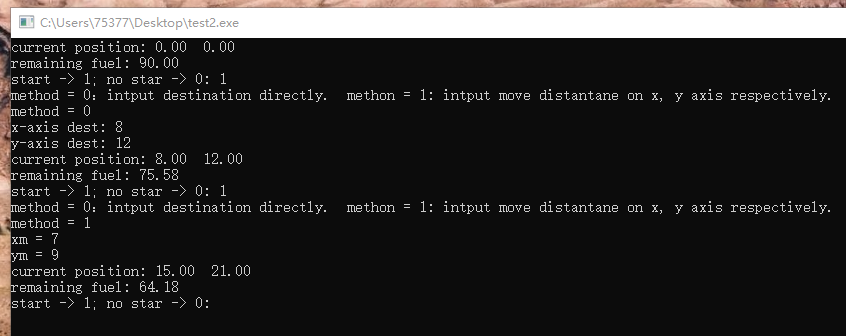 #include <stdio.h> #include <math.h> #define sqr(x) ((x) * (x)) typedef struct{ double x; double y; } Point; typedef struct{ Point pt; double fuel; } Car; double dist(Point a, Point b) // 计算两点之间距离的程序 { return sqrt(sqr(a.x - b.x) + sqr(a.y - b.y)); } void put_info(Car x) // 显示car型结构体各个构成元素, 当前的坐标, 当前的燃料 { printf("current position: %.2f %.2f\n", x.pt.x, x.pt.y); printf("remaining fuel: %.2f\n", x.fuel); } int move(Car *now, Point des) // 进行移动的程序,形参为Car型结构体,和Point型结构体 { double d = dist(now -> pt, des); // 利用dist函数计算当前坐标到目标的距离 if(now -> fuel < d) // 如果燃油低于距离,返回0,(1个单位燃料,1个单位距离) return 0; now -> pt = des; // 将当前的坐标改为目标地的坐标 now -> fuel -= d; // 当前的燃油减去距离(耗油量) return 1; } int main(void) { Car begin = {{0.0, 0.0}, 90.0}; // 声明起始位置 while(1) { int choose; Point dest; // 声明目的地结构体 put_info(begin); // 显示当前的坐标,燃料 printf("start -> 1; no star -> 0: "); // 选择是否启动 scanf("%d", &choose); if(choose != 1) break; int method; puts("method = 0:intput destination directly. methon = 1: intput move distantane on x, y axis respectively."); printf("method = "); scanf("%d", &method); if(method == 0) { printf("x-axis dest: "); scanf("%lf", &dest.x); // 输入目的地坐标 printf("y-axis dest: "); scanf("%lf", &dest.y); } if(method == 1) { double xm, ym; printf("xm = "); scanf("%lf", &xm); printf("ym = "); scanf("%lf", &ym); dest.x = xm + begin.pt.x; dest.y = ym + begin.pt.y; } if(!(move(&begin, dest))) // 如果move的返回值为0, 输出燃料不足提示信息。 puts("fuel sortage, unable to drive!!!"); //程序结束的条件时输入非1的数字 } return 0; }