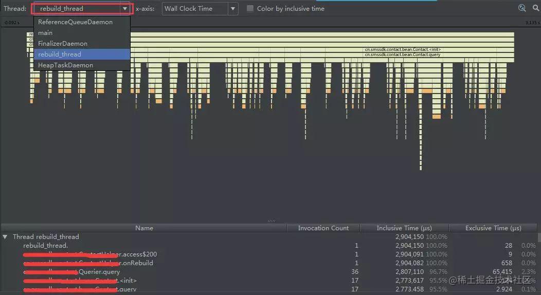 以上就是 CPU Profiler 和 traceview 的使用方法。至于如何制定优化方案,就不展开了,并没有完全固定的路子。就我本例的 onRebuild() 方法而言,是针对耗时的Contact构造过程做了并行处理,将上百个有序的构造过程平分到5个线程中并发执行,然后再按顺序合并数据到一个线程中。最终 onRebuild() 执行速度从15秒提升到了2.5秒,对我来说已经够用了。