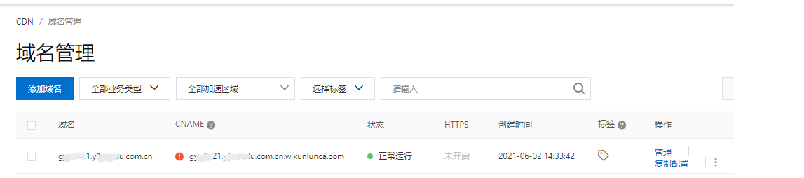 这个文档涉及到进行oss自定义域名绑定,然后受之前问题一的影响,在给oss绑定二级域名的时候,也是跟上面方法一样,导致cdn域名管理配置完之后报错没有配置cname。