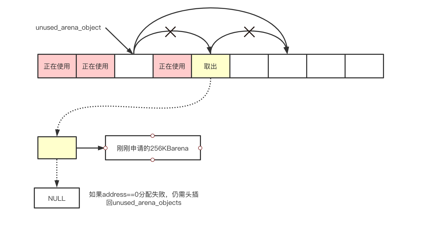 将arena维护的pools的内存归还给系统之外,Python还调整了usable_arenas和unused_arena_object链表,将arena的状态转到了“未使用”状态,以及一些其他的维护工作。