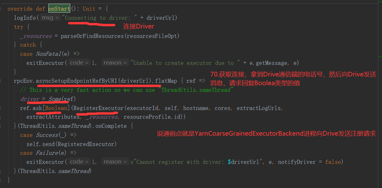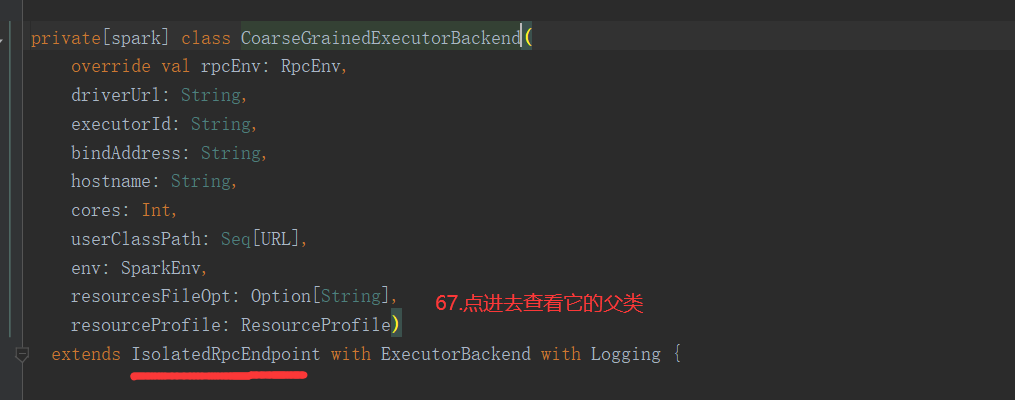 //Executor的通信终端 private[spark] class CoarseGrainedExecutorBackend( override val rpcEnv: RpcEnv, driverUrl: String, executorId: String, bindAddress: String, hostname: String, cores: Int, userClassPath: Seq[URL], env: SparkEnv, resourcesFileOpt: Option[String], resourceProfile: ResourceProfile) extends IsolatedRpcEndpoint with ExecutorBackend with Logging