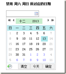 <input id="d442" type="text" class="Wdate" onFocus="WdatePicker({disabledDays:[0,6]})"/>
