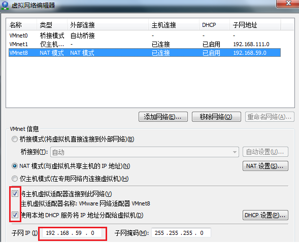 虚拟机采用 NAT 模式,查看下面两个勾是否勾中,子网地址必须是你上面那个 ip 的同段,比如虚拟机 ip 地址为 192.168.71.128,那么这里的子网地址必须是 192.168.59.*
