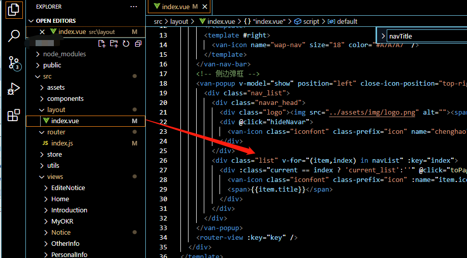 项目布局结构:在APP.vue基础上,我添加了一个layout布局,分别放 顶部导航,侧边弹框和router-view渲染的界面,如下图所示: