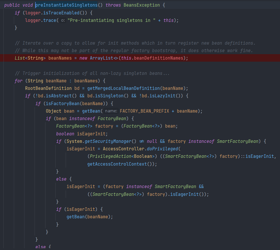 之后将会循环遍历需要创建bean对象的列表,调用getBean方法