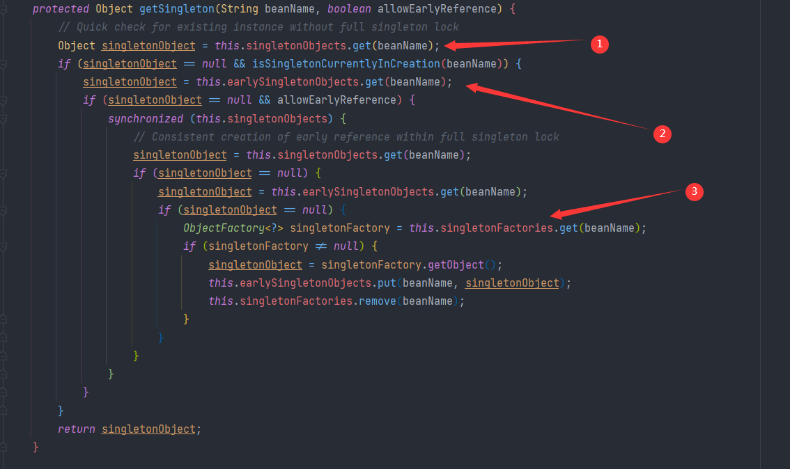 此时获取到只实例化的A对象后,将第三级缓存中的A对象移除,放到二级缓存中,值得注意的是B对象在初始化前也会将自己放入三级缓存中,由于自身的依赖已经解决,B对象在getSingleton方法返回前又会将自己的从三级缓存中删除放到一级缓存中。