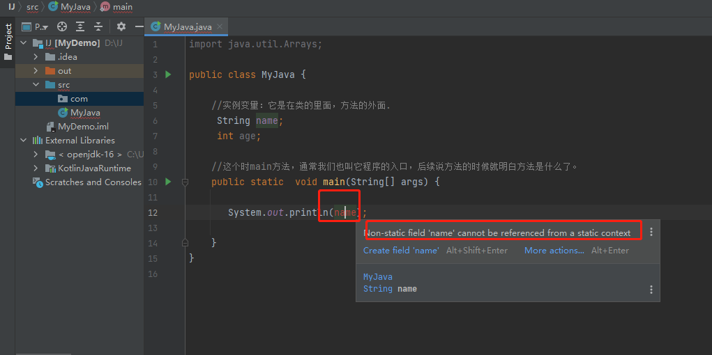 import java.util.Arrays; public class MyJava { //这个时main方法,通常我们也叫它程序的入口,后续说方法的时候就明白方法是什么了。 public static void main(String[] args) { //局部变量,写在方法里面 int a=10;//注意:局部变量如果不赋初始值,是不能输出的 System.out.println(a); } }