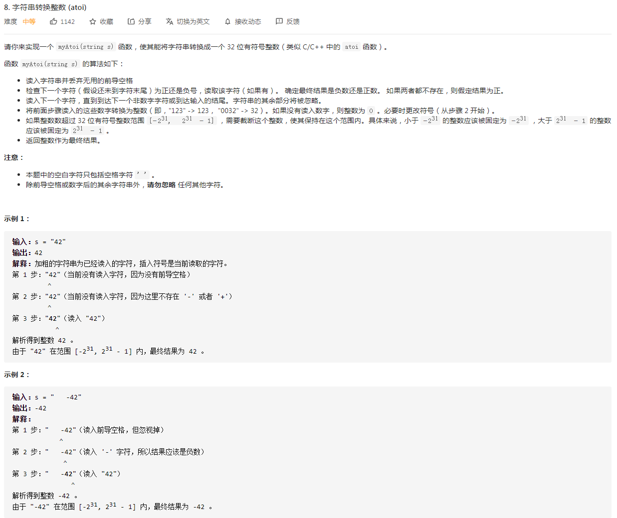 class Solution { public: int myAtoi(string s) { int ret = 0; if (s.size() == 0){ return ret; } const char*p = s.c_str(); int i = 0; while(p[i] ==‘ ‘) i++; bool big0 = true; if ((p[i] != ‘+‘) && (p[i] != ‘-‘)){ if (!(p[i] >= ‘0‘) && (p[i] <= ‘9‘)){ return ret; } }else{ if (p[i] == ‘-‘){ big0 = false; } i++; if (!(p[i] >= ‘0‘) && (p[i] <= ‘9‘)){ return ret; } } char a[11] = {-1,-1,-1,-1,-1,-1,-1,-1,-1,-1,-1}; // 大于10位就不用看了 int j = 0; while((p[i] >= ‘0‘) && (p[i] <= ‘9‘)){ if (j == 11){ break; } if (p[i] > ‘0‘) { a[j] = p[i] - ‘0‘; j++; }else{ if (j == 0){ }else{ a[j] = 0; j++; } } i++; } if (a[9] == -1){ // 9 位 一定没有越界 for(int k = 0;k<9;k++){ if (a[k]>=0){ ret = ret * 10 + a[k]; }else{ break; } } if (!big0){ ret = 0 - ret; } return ret; } if (a[10] == -1) { // 10位 可能越界了 if (big0){ int b[10] = {2,1,4,7,4,8,3,6,4,7}; for(int k=0;k<10;k++){ if (a[k] == b[k]){ }else if (a[k] > b[k]){ // 越界了 a[k]待验证数组 首先出现大的情况 return 2147483647; }else{ for(int l=0;l<10;l++){ ret = ret * 10 + a[l]; } return ret; } } return 2147483647; }else{ // 可能是 9 或者10 int b[10] = {2,1,4,7,4,8,3,6,4,8}; for(int k=0;k<10;k++){ if (a[k] == b[k]){ }else if (a[k] > b[k]){ // 越界了 return -2147483648; }else if (a[k] < b[k]){ for(int l=0;l<10;l++){ ret = ret * 10 + a[l]; } return 0 - ret; } } return -2147483648; } }else{ // 一定 越界了 if (big0){ return 2147483647; }else{ return -2147483648; } } } };