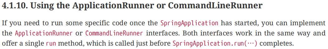 @Order(1) @Component class Clrunner implements CommandLineRunner { @Override public void run(String... args) throws Exception { System.out.println("running in Clrunner..."); System.out.println(args.length); for (int i=0; i<args.length; i++) { System.out.println(i + "," + args[i]); } } } @Order(2) @Component class Apprunner implements ApplicationRunner { @Override public void run(ApplicationArguments args) throws Exception { System.out.println("running in Apprunner..."); String[] params = args.getSourceArgs(); System.out.println(params.length); for (int i=0; i<params.length; i++) { System.out.println(i + "," + params[i]); } } }