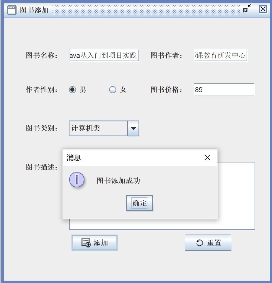 4)信息都填写后(图书描述可以为空),点击添加,会提示信息添加成功,同时可以在数据库中(或者图书维护)显示记录