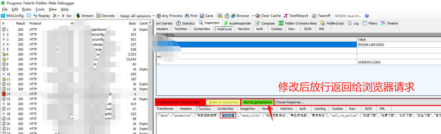 浏览器触发请求,捕捉到匹配的请求后选中,右侧选择 Inspector,修改相应的内容再放行
