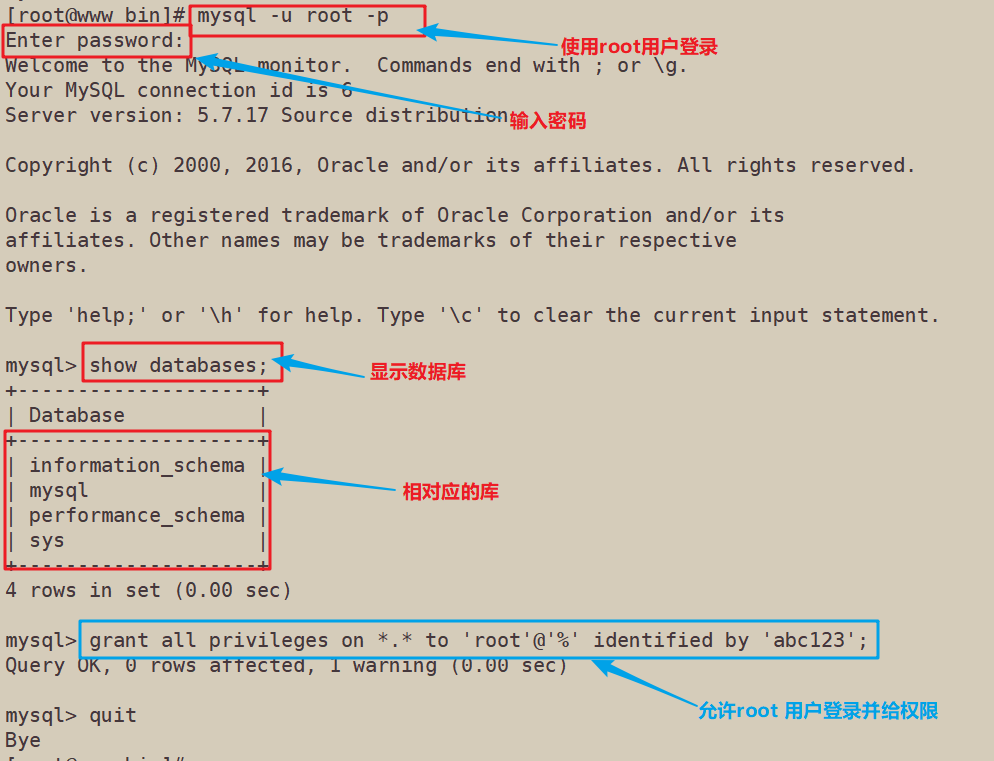 [root@www bin]# mysql -u root -p Enter password: Welcome to the MySQL monitor. Commands end with ; or \g. Your MySQL connection id is 6 Server version: 5.7.17 Source distribution Copyright (c) 2000, 2016, Oracle and/or its affiliates. All rights reserved. Oracle is a registered trademark of Oracle Corporation and/or its affiliates. Other names may be trademarks of their respective owners. Type ‘help;‘ or ‘\h‘ for help. Type ‘\c‘ to clear the current input statement. mysql> show databases; +--------------------+ | Database | +--------------------+ | information_schema | | mysql | | performance_schema | | sys | +--------------------+ 4 rows in set (0.00 sec) mysql> grant all privileges on *.* to ‘root‘@‘%‘ identified by ‘abc123‘; Query OK, 0 rows affected, 1 warning (0.00 sec) mysql> quit Bye