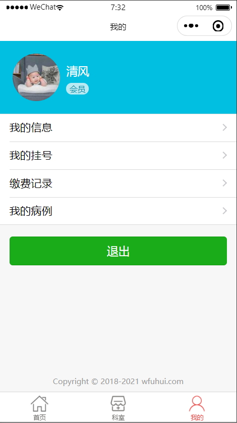个人中心显示我的信息(可编辑,修改头像),我的挂号,我的缴费,我的病例