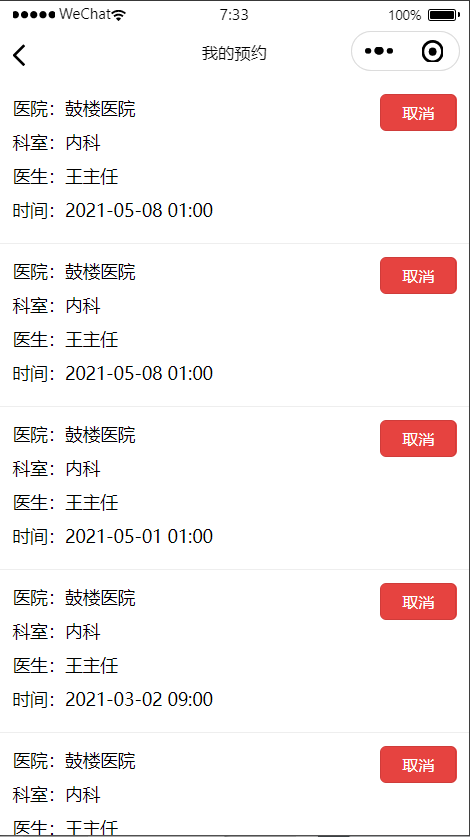 点击医生进入医生详情,可以点击预约挂号,挂号选择日期时间提交