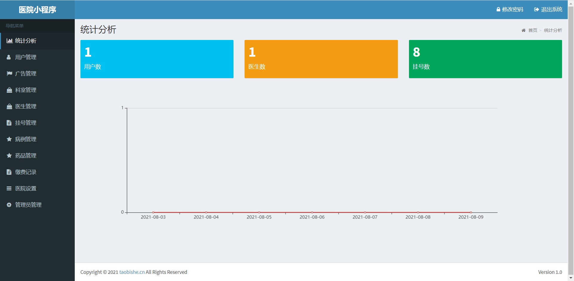 统计分析:查看用户,医生,报名数量;统计近7日报名趋势