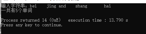 1 #include<stdio.h> 2 int main() 3 { 4 char str[100]; //定义一个字符数组 5 int i,num=0,count=0; //num用来记录单词个数,count是信号值 6 char c; 7 printf("输入字符串:"); 8 gets(str); //gets函数可以用来输入带有空格的字符串 9 for(i=0;(c=str[i])!=‘\0‘;i++) //如果没有查找到‘\0‘标识符,则一直运行 10 { 11 if(c==‘ ‘) count=0; //如果遇到空格则将信号值设置为0 12 else if(count==0) //遇到非空格符,同时信号值为0时才会判断是一个单词 13 { 14 count=1; 15 num++; //单词数加一 16 } 17 } 18 printf("一共有%d个单词\n",num); 19 20 }