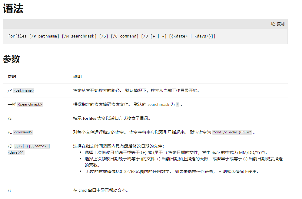 这是msdn中关于forfiles命令作用的说明概览,下面我们看一下具体的forfiles命令的语法: