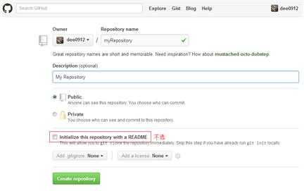 ②填写仓库名称和描述,不需要勾选 Initialize this repository with a README。