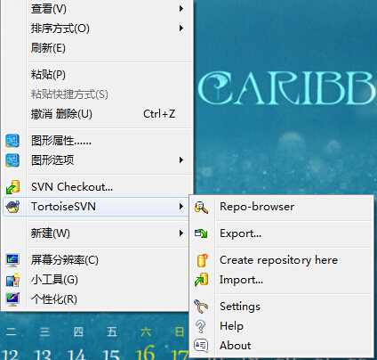 接着就是安装TortoiseSVN了,先安装 主程序,再安装语言包。安装好语言包之后,在桌面上右键,选择TortoiseSVN: