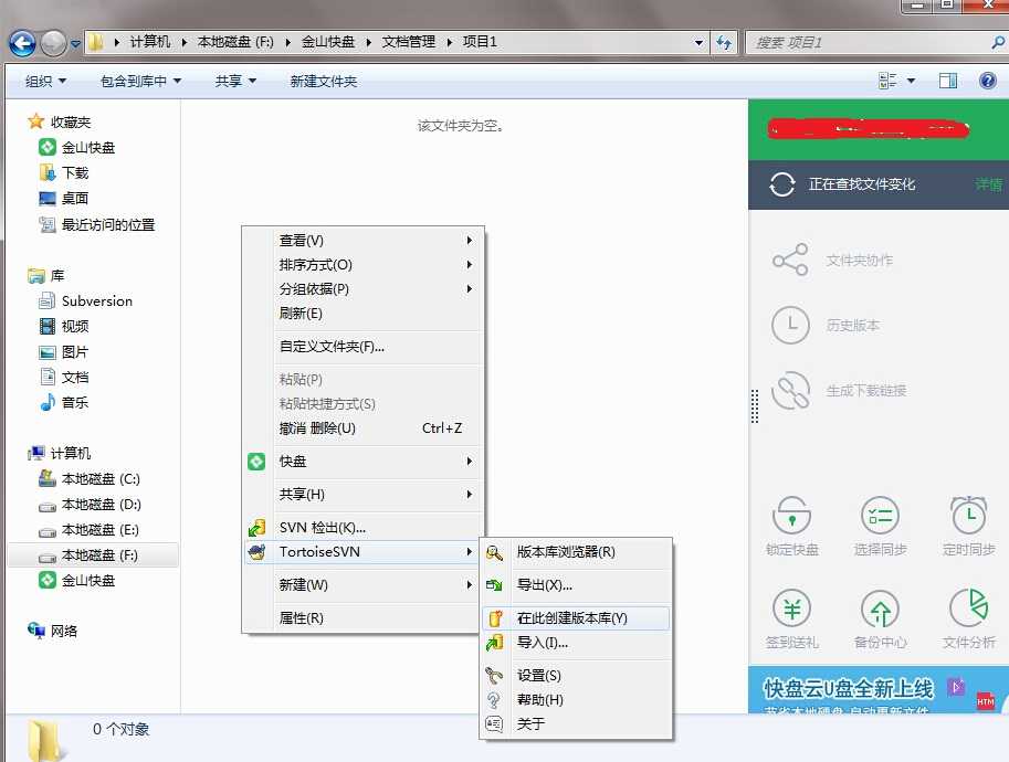 1.进入“金山快盘”文件夹,新建文件夹,比如说命名为”文档管理“,如果想将每个项目文档分开,可以在该文件夹下再建立一个文件夹,比如”项目1“,然后进入该文件夹,右键TortoiseSVN,选择”在此创建版本库“。