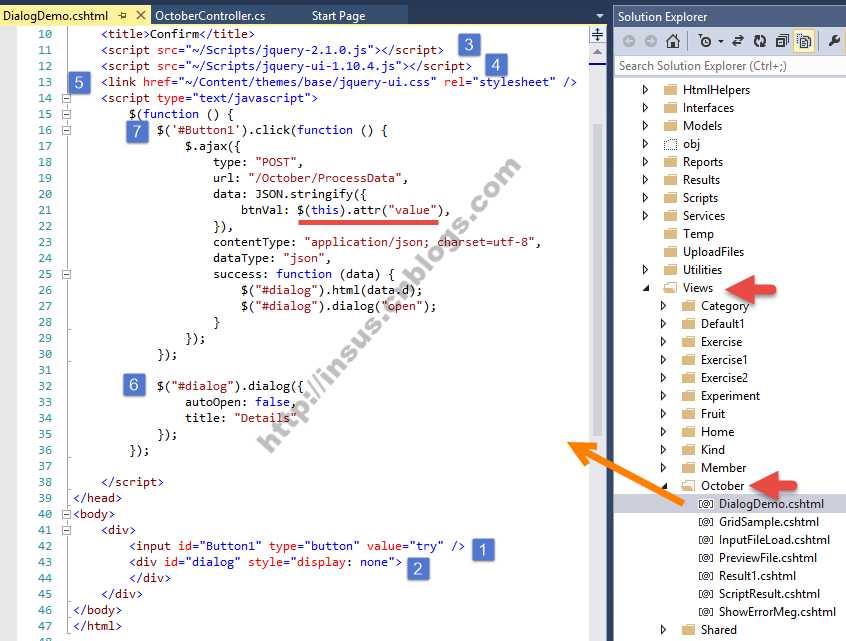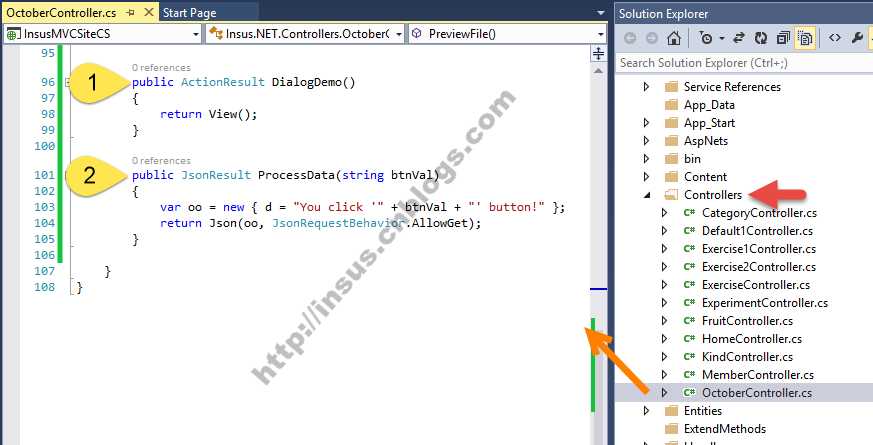 在October控制器创建两个Action操作,一个是为视图DialogDemo,一个是处理数据ProcessData: