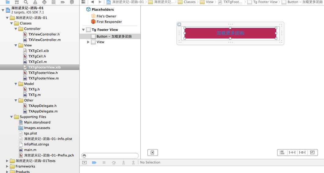 在实现上通过xib来进行处理,考虑到左右的留白,以及点击后的要切换到加载按钮和文字,要同时控制图标和文字,因此把加载图标和文字提示放在了一个view中以便控制,这个xib已经和YYfooterview.xib进行了关联,通过这个类来控制xib。