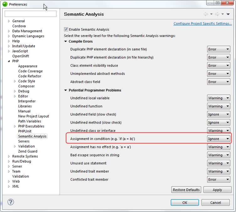具体设置为,依次打开 偏好设置 –> PHP –> Semantic Analysis Properties,展开右边Potential Programmer Problems,在其下面可以找到“Assignment in condition(e.g. ‘if(a=b)’),把Warning修改Ignore,保存设置就彻底去掉这个警告提示了。