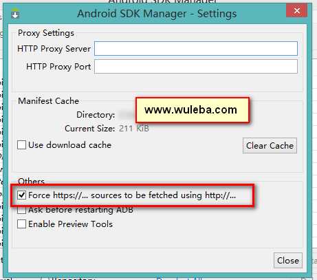 2、接下来,便是关键的一个步骤,这一步就确定了是否能够成功下载安卓系统包的情况。如图,在新的窗体中勾选以Force开头的复选框按钮,然后鼠标点击“Close”按钮关闭窗口并保存以上用户设置。