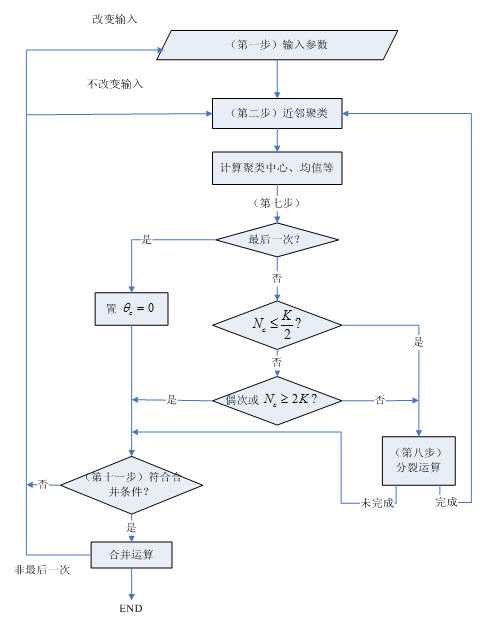 (3)~(5)按给定的要求,将前一次获得的聚类集进行分裂和合并处理((4)为分裂处理,(5)为合并处理),从而获得新的聚类中心。