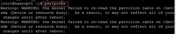 ② 输入命令:partprobe,让分区表生效。