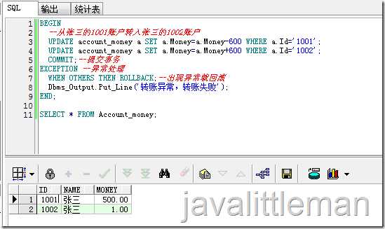 BEGIN --从张三的1001账户转入张三的1002账户 UPDATE account_money a SET a.Money=a.Money-600 WHERE a.Id=‘1001‘; UPDATE account_money a SET a.Money=a.Money+600 WHERE a.Id=‘1002‘; COMMIT;--提交事务 EXCEPTION --异常处理 WHEN OTHERS THEN ROLLBACK;--出现异常就回滚 Dbms_Output.Put_Line(‘转账异常,转账失败‘);