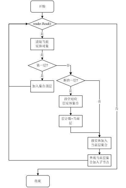 最后需要在前台界面将其显示出来,由于记录已经按层次返回,需要做的就是按层次首其输出,首先将第0层数据输出,接下来将遍历第0层数据,将第一层 数据添加到合适的父对象中,重复此过程直到填充结果。那么这里的难题就在于如何查找父对象,我们当然可以遍历集合,但是这么做的话如果数据量很大将导致效 率低下。既然可以得到当前对象所位于的层的信息,就也是这树倒置的树是一层一层向下填充的,我们可以定义一个临时集合变量,存储当前层上一层的所有父对 象,在插入当前层对象时遍历集合变量以插入到合适的位置,同时我们还必须保证在逐层读取数据时临时集合变量中持有的始终时当前层上一层所有的对象,程序流 程图如下所示: