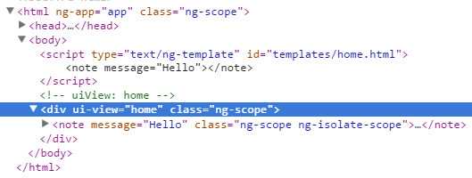 <!DOCTYPE html> <html ng-app="app"> <head> <title></title> <link href="//maxcdn.bootstrapcdn.com/bootstrap/3.3.1/css/bootstrap.min.css" rel="stylesheet"> <script src="//cdnjs.cloudflare.com/ajax/libs/angular.js/1.3.3/angular.js"></script> <script src="//cdnjs.cloudflare.com/ajax/libs/angular-ui-router/0.2.11/angular-ui-router.js"></script> <script src="app.js"></script> </head> <body> <script type="text/ng-template" id="templates/home.html"> <note message="Hello"></note> </script> <ui-view></ui-view> </body> </html>