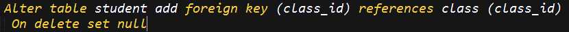 Foreign key (外键字段) references 主表名 (关联字段) [主表记录删除时动作][主表记录更新时记录]