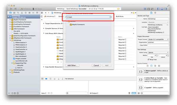 3、选择iOS 8.0-->MapKit.framework,最后点击add即可。