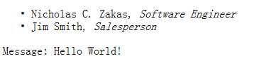 <?xml version="1.0"?> <xsl:stylesheet version="1.0" xmlns:xsl="http://www.w3.org/1999/XSL/Transform"> <xsl:output method="html" /> <xsl:param name="message" /> <xsl:template match="/"> <ul> <xsl:apply-templates select="*" /> </ul> <p>Message: <xsl:value-of select="$message" /></p> </xsl:template> <xsl:template match="employee"> <li><xsl:value-of select="name" />, <em><xsl:value-of select="@title" /></em></li> </xsl:template> </xsl:stylesheet>